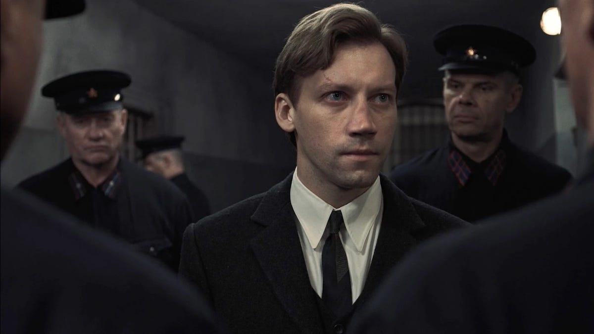 It’s 1937 in the USSR, the height of. Stalin’s tyrannical rule and the crackdown on dissidents by the NKVD (both the Soviet interior ministry and the secret police). A young, fresh-out-of-law-school prosecutor Kornev (Alexander Kuznetsov) receives a note asking for his help, written in blood, from an inmate serving time in solitary confinement. Kornev decides to follow up, not having a clue what he’s really up against.
